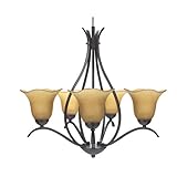 Elegantly crafted and superbly designed, this designer fixture from the Senneville collection is a classic addition to your decor. Made of amber-colored seeded glass, the shades are complemented by a decadent dark coffee finish. Five graceful arms join curved extensions to focus the chandelier up past the delicate flower-shaped glass. The end result is an eye-catching style that works with both traditional and contemporary home furnishings. This Globe five-light chandelier is 26 inches wide and requires five medium base A15-type light bulbs, 60 watts each (sold separately).